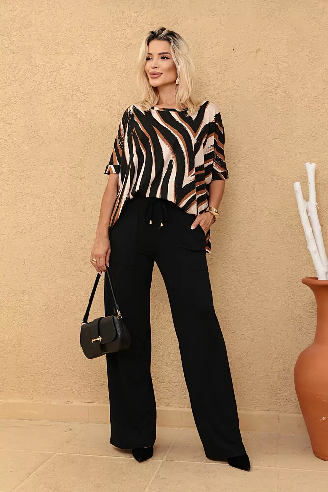 Conjunto composto por blusa ampla na malha visco lycra estampada e calça flare no moletinho gramatura 300. Estampa exclusiva um luxo. Um tecido premium ideal pra todas as estações. conforto e estilo Anti-pilling Tamanhos M g gg g1 M 38/40 G 42/44 Gg 46/48 G1 50/52