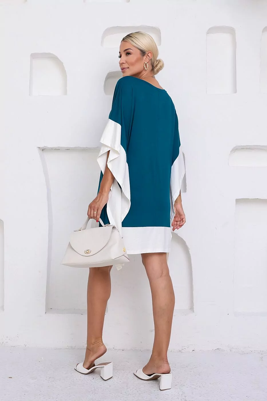 Vestido curto, com manga morcego, barra e mangas em cores diferentes, decote canoa, em malha visco lycra premium, gramatura 290. Clássico que não sai de moda. São duas cores incríveis e maravilhosas. Um tecido premium ideal pra todas as estações. Conforto e estilo. Anti-pilling.